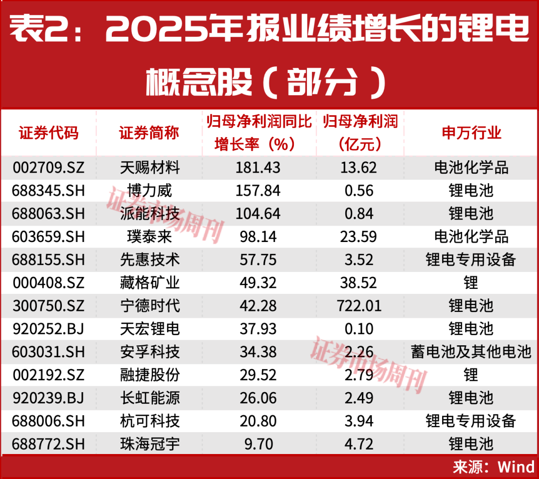 除了融捷股份、富祥药业、宁德时代等,还有多家锂电池概念股披露了2025年财报,天赐材料、博力威、派能科技均实现超100%以上的增长(见表2)。