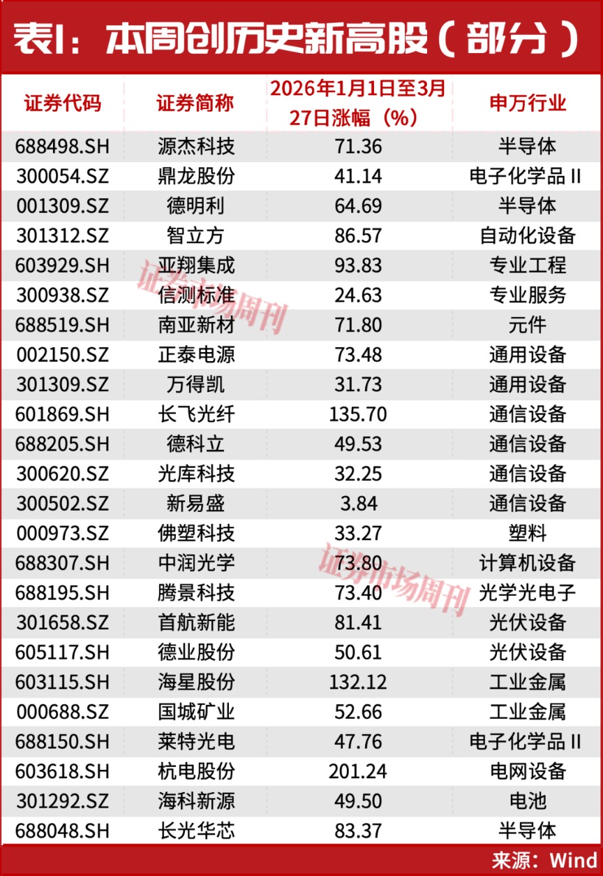 壹号国际慢牛且创新高个股批量出现。除了上述提及的源杰科技、德明利、鼎龙股份等,这周还有其他一众个股创出新高,如德科立、南亚新材、新易盛等,它们以AI算力硬件、光通信、半导体等个股居多(见表1)。